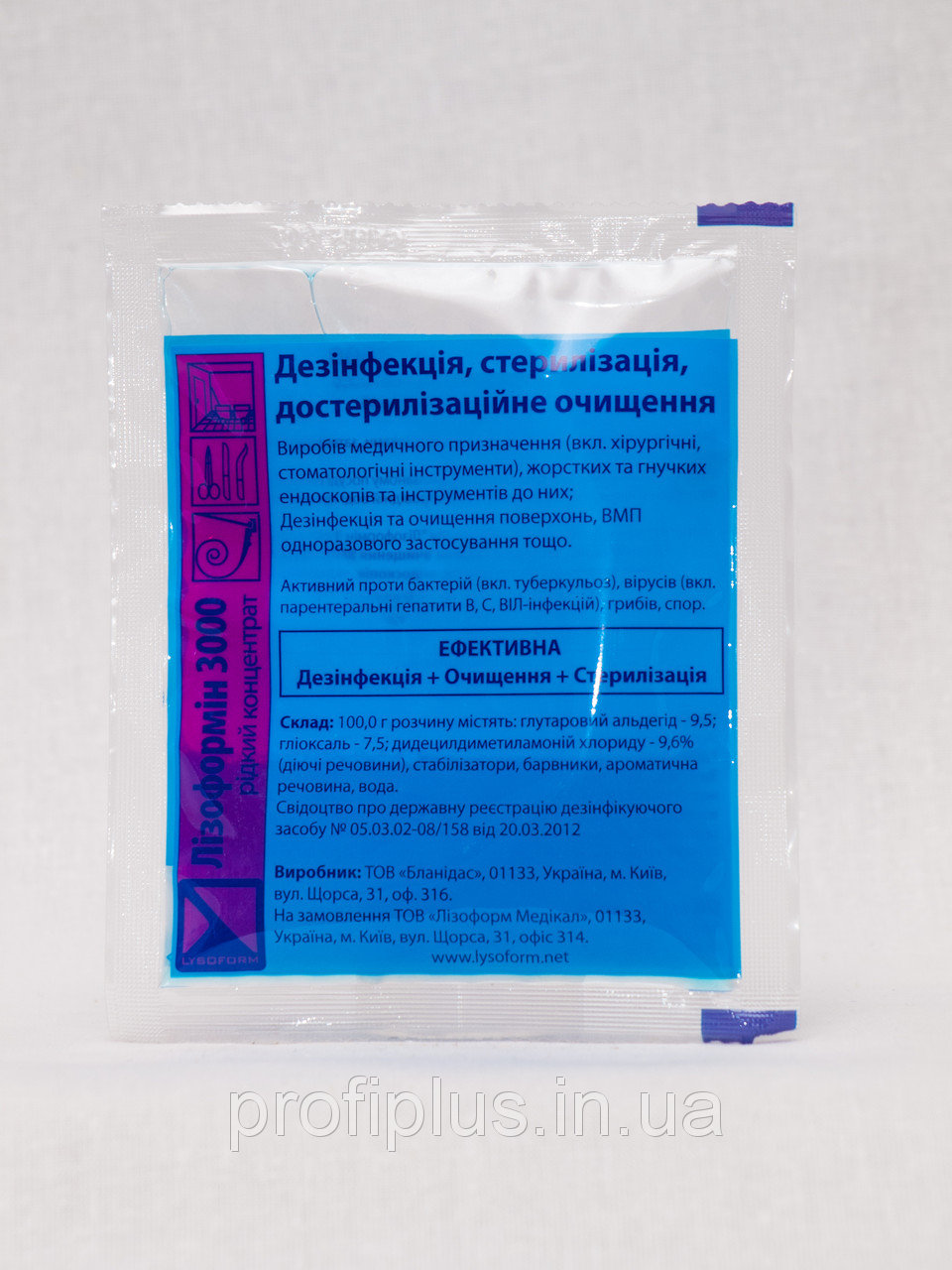 Універсальний комбінований альдегідний засіб для поточної, заключної, профілактичної дезінфекції всіх типів поверхонь, для проведення генеральних прибирань, для знезараження медичних виробів (дезінфекція + до стерилізаційне очищення + стерилізація, дезінфекція високого рівня), в тому числі ендоскопів.